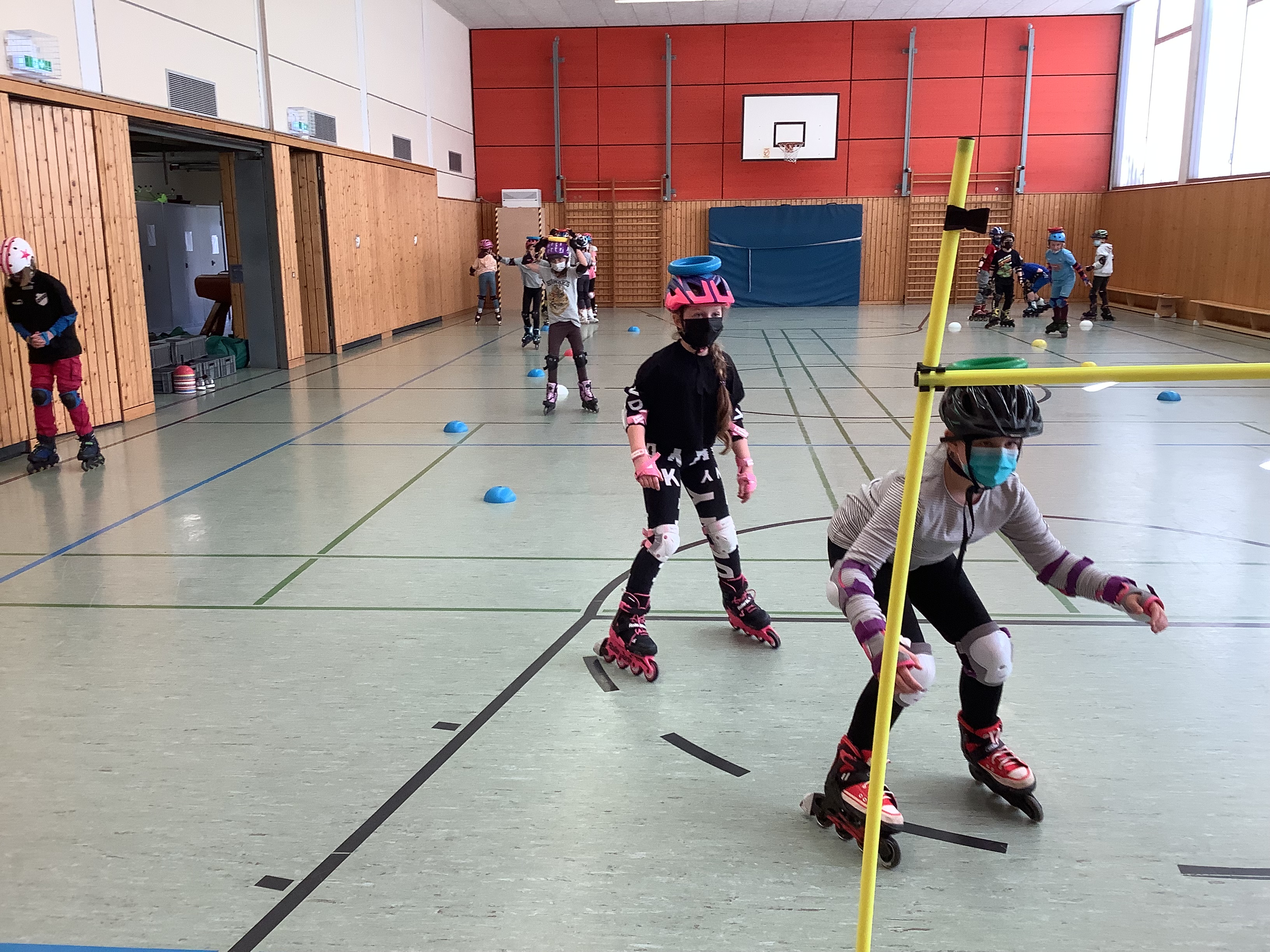 Dabei finden auch absolute Anfängerinnen und Anfänger erstaunlich schnell den Dreh heraus und gleiten durch die Halle. Nicht nur das Aufstehen mit Skates wird geübt, sondern auch das Bremsen und richtige Hinfallen.
