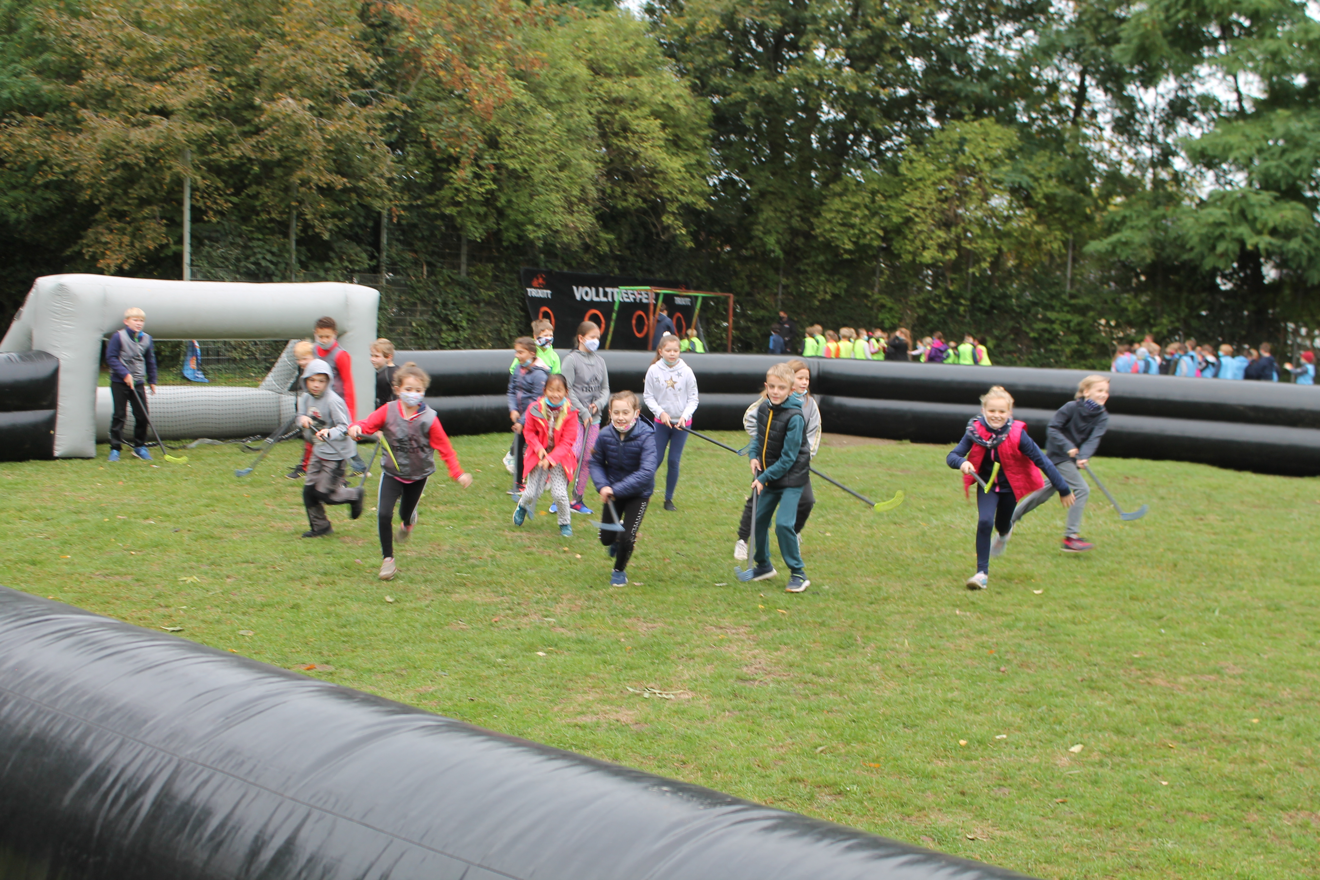 In der Regel alle zwei Jahre veranstalten wir rund um die Turnhalle das Schulsport-Event Trixitt. Einen Schulvormittag nur Sport: Menschenkicker, Basketball, Hockey, Speedmaster, Wurfbude, Hindernislauf … Jedes Mal wieder ein toller Schulvormittag!