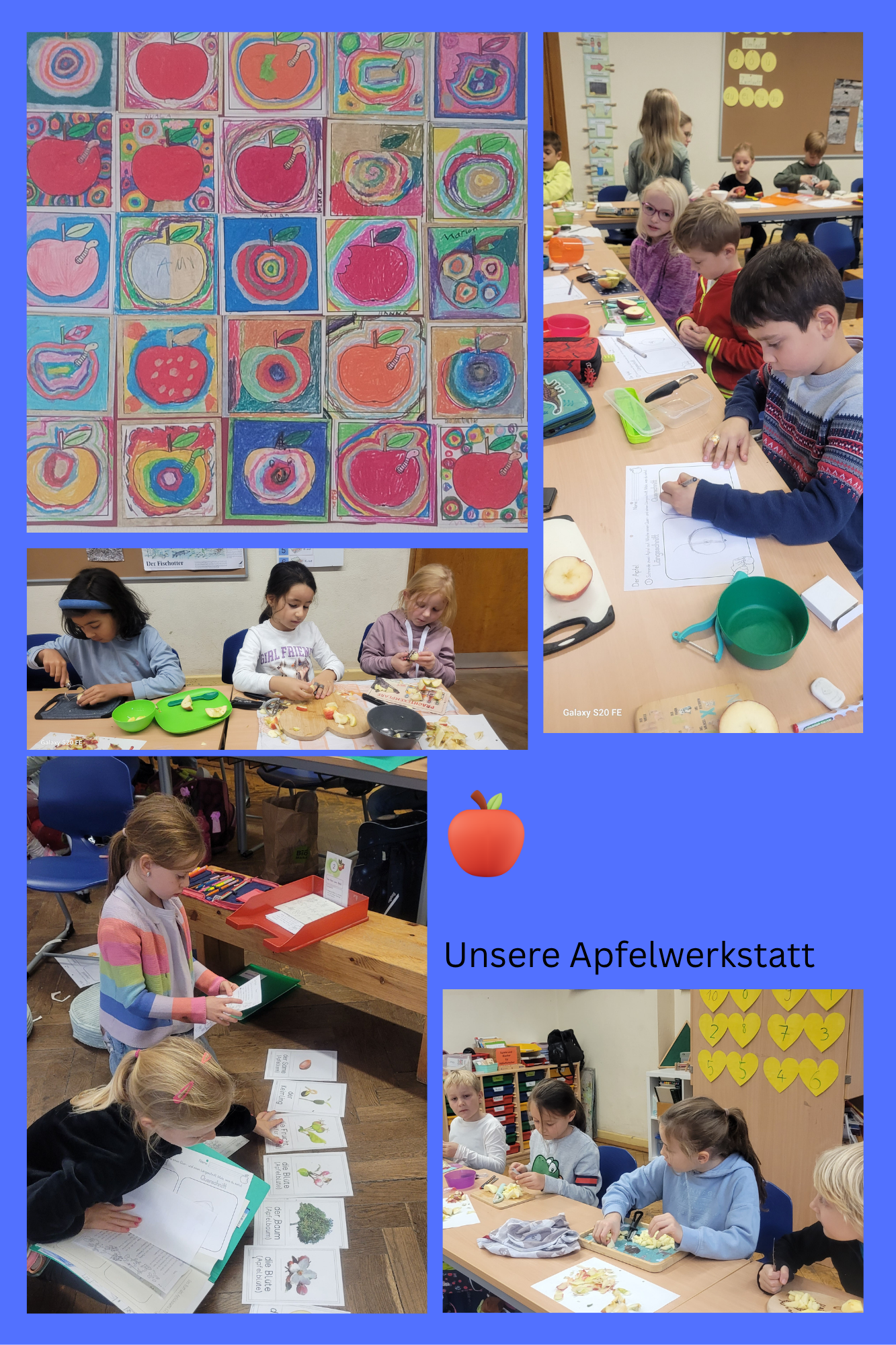 Wir sind die Klasse 2a. Im Oktober drehte sich bei uns alles um den Apfel. Wir haben geforscht, gezeichnet, gelesen, Äpfel geschält, Apfelmus gekocht, gemalt und natürlich auch eine Menge Äpfel gegessen. Jetzt sind wir richtige Apfel-Experten.